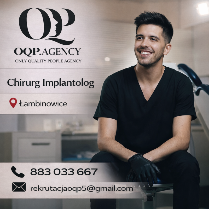 Nowoczesna placówka stomatologiczna Medistica zaprasza do współpracy Lekarza Dentystę – Chirurga Implantologa Tworzymy miejsce, w którym liczy się konkret: rzetelna diagnostyka, przemyślany plan leczenia i precyzyjnie wykonane zabiegi. Dbamy o zdrowy, estetyczny uśmiech całej rodziny. Pracujemy na wysokiej klasy materiałach, stawiamy na jakość, przewidywalność i partnerskie podejście do pacjenta. O nas • 4 nowocześnie wyposażone gabinety stomatologiczne • własna pracownia RTG (zdjęcia wewnątrzustne, panoramiczne, cefalometryczne, tomografia CBCT) • zespół: 7 lekarzy dentystów, 3 higienistki, 4 asystentki, 2 rejestratorki • współpraca ze sprawdzonymi pracowniami protetycznymi • autoryzowany partner systemu implantologicznego Straumann • wysoka kultura obsługi i dobra atmosfera pracy Zakres obowiązków • chirurgia stomatologiczna • implantologia (planowanie i prowadzenie leczenia implantologicznego) • współpraca z zespołem przy kompleksowych planach leczenia • konsultacje i tworzenie czytelnych planów terapeutycznych dla pacjentów Oferujemy • pracę w nowoczesnej, dobrze zorganizowanej placówce • dostęp do pełnej diagnostyki RTG i CBCT na miejscu • atrakcyjne wynagrodzenie (warunki ustalane indywidualnie) • elastyczne dni i godziny pracy • wsparcie doświadczonego zespołu asystenckiego • możliwość realnego wpływu na rozwój implantologii w placówce Oczekujemy • doświadczenia w chirurgii stomatologicznej i implantologii • samodzielności w planowaniu i prowadzeniu leczenia • umiejętności pracy zespołowej • wysokiej kultury osobistej i profesjonalnego podejścia do pacjenta • chęci rozwoju i podnoszenia kwalifikacji Jeśli szukasz miejsca, w którym możesz pracować na dobrym sprzęcie, z rozsądnym zespołem i bez chaosu organizacyjnego – zapraszamy do kontaktu. 📩 Prosimy o przesłanie CV na adres: rekrutacjaoqp5@gmail.com 📞 Kontakt telefoniczny: 883033667 W CV prosimy zawrzeć klauzulę: „Wyrażam zgodę dla OQP.agency Sp. z o.o. na przetwarzanie podanych przeze mnie w dokumentach aplikacyjnych danych osobowych dla potrzeb związanych z realizacją procesu rekrutacyjnego na stanowisko Lekarza oraz przyszłych i nieokreślonych na obecną chwilę procesów rekrutacyjnych, które odbędą się w okresie najbliższych 5 lat. Każdą z wyrażonych wyżej zgód mogę w każdej chwili cofnąć. Administratorem Pani/Pana danych osobowych jest OQP.agency Sp. z o.o. z siedzibą w Warszawie (01-142), przy ul. Sokołowskiej 7/8.”