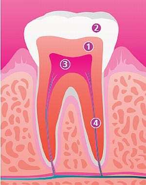 1- zębina ; 2 – szkliwo 3 – komora wypełniona miazgą; 4 – kanał zębowy z miazgą