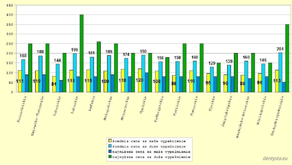 Na przedstawionym wykresie zostały zamieszczone średnie ceny stałych wypełnień kompozytowych światłoutwardzalnych w odniesieniu do poszczególnych województw. Dla każdego regionu przedstawiono również najniższe znalezione ceny za małe wypełnienie oraz maksymalne podane w cennikach kwoty za duże wypełnienia. Określenia „małe” i „duże” wypełnienia zastosowany zostały zamiast konkretnego określania ilości opracowanych i wypełnianych powierzchni zęba ponieważ w wielu cennikach przedstawionych na stronach internetowych gabinetów podane były w ten sposób, a konieczne było ujednolicenie nazewnictwa dla potrzeb analizy danych. Ceny pokrycia materiałem kompozytowym powierzchni wargowych zębów przednich, w postaci tzw. licówek kompozytowych nie były brane pod uwagę.
