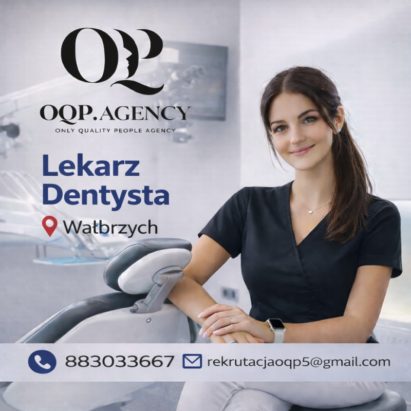 Kogo szukamy? • osoby z minimum 2-letnim doświadczeniem po stażu, • lekarza otwartego i komunikatywnego, który potrafi zdiagnozować i wytłumaczyć pacjentowi proces leczenia, • specjalisty, który nie ogranicza się do jednego dnia pracy i jest dostępny w razie pilnych sytuacji, • osoby punktualnej, uczciwej, lubiącej pracę zespołową i zaangażowanej w rozwój praktyki, • mile widziana umiejętność pracy pod mikroskopem, z koferdamem i skanerem – ale wszystkiego nauczymy, jeśli trzeba. Jak aplikować? Zapraszamy do kontaktu telefonicznego, mailowego lub przesłania CV. 📧 E-mail: rekrutacjaoqp5@gmail.com 📞 Tel.: 883 033 667 W CV prosimy o zawarcie poniższej klauzuli: Wyrażam zgodę dla OQP.agency Sp. z o.o. na przetwarzanie podanych przeze mnie w dokumentach aplikacyjnych danych osobowych dla potrzeb związanych z realizacją procesu rekrutacyjnego na stanowisko Lekarza oraz przyszłych, nieokreślonych na obecnym etapie procesów rekrutacyjnych, które mogą odbyć się w ciągu najbliższych 5 lat. Każdą z wyrażonych wyżej zgód mogę w każdej chwili cofnąć. Administratorem danych osobowych jest OQP.agency Sp. z o.o. z siedzibą w Warszawie (01-142), ul. Sokołowska 7/8.