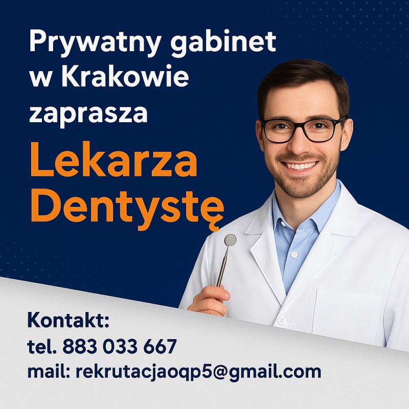 LEKARZ DENTYSTA – KRAKÓW Pełny grafik prywatnych pacjentów | Nowoczesny sprzęt | Komfortowa praca Do nowoczesnej, prywatnej kliniki stomatologicznej w Krakowie poszukujemy Lekarza Dentysty do współpracy w ramach B2B. Zapewniamy pełne grafiki pacjentów prywatnych, pracę w świetnej atmosferze i dostęp do najbardziej zaawansowanych technologii, które pozwalają wykonywać zabiegi komfortowo i bezboleśnie. O nas Od momentu powstania naszego gabinetu skupiamy się na dostarczaniu pacjentom najwyższej jakości usług. Pracujemy na nowoczesnych i zaawansowanych technologicznie urządzeniach, które pozwalają nam realizować nawet najbardziej skomplikowane procedury – od leczenia kanałowego pod mikroskopem po pełną rekonstrukcję uzębienia. Rozumiemy, jak stresująca dla wielu pacjentów jest wizyta u dentysty, dlatego zapewniamy maksymalny komfort – zarówno w trakcie zabiegu, jak i podczas całej wizyty. Nasz zespół to osoby z empatycznym podejściem, które potrafią zbudować zaufanie i dobre relacje z pacjentami. Dlaczego warto do nas dołączyć? • Pełny grafik pacjentów prywatnych od pierwszego dnia pracy. • Atrakcyjne wynagrodzenie (forma B2B – szczegóły podczas rozmowy). • Nowoczesny sprzęt: mikroskopy endodontyczne, skanery wewnątrzustne 3D, tomografia CBCT, cyfrowe RTG, aparaty do zdjęć wewnątrzustnych. • Praca bez stresu – dobra organizacja, sprawna rejestracja, pełne wsparcie asysty. • Elastyczny grafik – dopasujemy godziny do Twojej dyspozycyjności. • Zgrany, przyjazny zespół lekarzy i higienistek. • Szkolenia i rozwój – wspieramy udział w kursach i konferencjach, prowadzimy wewnętrzne konsultacje kliniczne. • Stabilne zatrudnienie – pacjenci prywatni, wysoka frekwencja wizyt, wieloletnie zaufanie lokalnej społeczności. ________________________________________ Zakres obowiązków • Konsultacje i kompleksowe leczenie stomatologiczne pacjentów dorosłych i dzieci. • Zabiegi zachowawcze, endodontyczne, protetyczne (zgodnie z kompetencjami). • Możliwość pracy interdyscyplinarnej z ortodontą, chirurgiem, protetykiem. • Dokumentacja medyczna w systemie elektronicznym. Nasze oczekiwania • Prawo wykonywania zawodu. • Doświadczenie w pracy z pacjentami prywatnymi (mile widziane specjalizacje lub szkolenia). • Wysoka jakość pracy i dbałość o detale. • Empatia, komunikatywność, kultura osobista. • Chęć rozwoju i pracy zespołowej. Lokalizacja Kraków – dwie nowoczesne placówki w dogodnych punktach miasta (Ruczaj i Nowa Huta). Jak aplikować? 📧 Prześlij swoje CV na adres: rekrutacjaoqp5@gmail.com 📞 Zadzwoń: 883 033 667 Prosimy o przesyłanie zgłoszeń wyłącznie na adres e-mail. Skontaktujemy się z wybranymi kandydatami. ________________________________________ Klauzula RODO (prosimy wkleić do CV) „Wyrażam zgodę dla OQP.agency Sp. z o.o. na przetwarzanie podanych przeze mnie w dokumentach aplikacyjnych danych osobowych dla potrzeb związanych z realizacją procesu rekrutacyjnego na stanowisko Lekarza oraz przyszłych, nieokreślonych na obecnym etapie procesów rekrutacyjnych, które mogą odbyć się w ciągu najbliższych 5 lat. Każdą z wyrażonych wyżej zgód mogę w każdej chwili cofnąć. Administratorem danych osobowych jest OQP.agency Sp. z o.o. z siedzibą w Warszawie (01-142), ul. Sokołowska 7/8.”