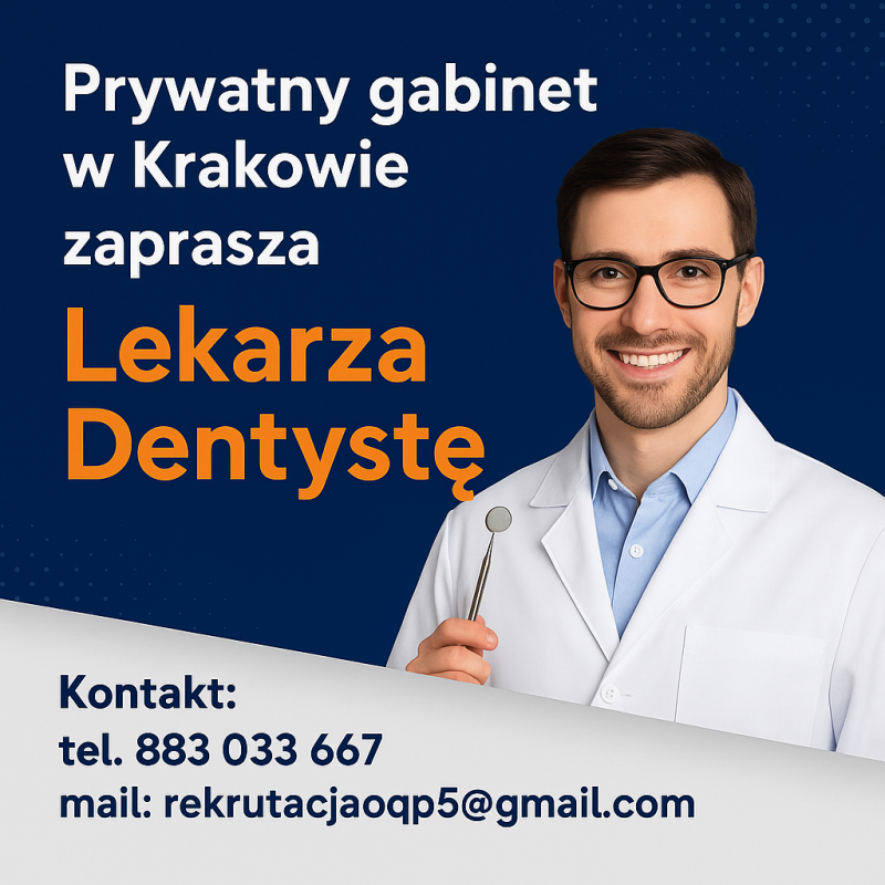 Do nowoczesnej, prywatnej kliniki stomatologicznej w Krakowie poszukujemy Lekarza Dentysty – Endodonty. Zapewniamy pełne grafiki pacjentów prywatnych, pracę na najwyższej klasy sprzęcie i w zespole, w którym liczy się jakość leczenia, współpraca i komfort pracy lekarza. ________________________________________ O nas Od początku działalności skupiamy się na świadczeniu usług stomatologicznych na najwyższym poziomie. Nasze gabinety są w pełni wyposażone w nowoczesne technologie, które umożliwiają precyzyjne, bezbolesne leczenie kanałowe pod mikroskopem oraz realizację nawet najbardziej wymagających procedur. Rozumiemy, że leczenie endodontyczne wymaga maksymalnej precyzji i komfortu pracy – dlatego inwestujemy w sprzęt, organizację pracy oraz doświadczoną asystę. ________________________________________ Dlaczego warto do nas dołączyć? • Pełny grafik pacjentów prywatnych od pierwszego dnia pracy. • Atrakcyjne wynagrodzenie (forma B2B). • Praca na nowoczesnym sprzęcie: o Mikroskopy endodontyczne w każdym gabinecie. o Tomografia CBCT i cyfrowe RTG (pantomogram, cefalometria). o Skanery wewnątrzustne 3D. o Endometry, systemy maszynowego opracowania kanałów. o Kamery wewnątrzustne i aparaty fotograficzne. • Komfort pracy – pełne wsparcie wykwalifikowanej asysty oraz rejestracji. • Elastyczne godziny – dostosowane do Twojej dyspozycyjności. • Przyjazny zespół i atmosfera sprzyjająca rozwojowi. • Możliwość współpracy interdyscyplinarnej (ortodoncja, protetyka, chirurgia). • Wsparcie w rozwoju zawodowym – szkolenia, konsultacje, udział w konferencjach. ________________________________________ Zakres współpracy • Diagnostyka endodontyczna z wykorzystaniem mikroskopu i CBCT. • Leczenie kanałowe z użyciem narzędzi maszynowych i nowoczesnych systemów obturacji. • Powtórne leczenie kanałowe (re-endo). • Współpraca z innymi specjalistami w ramach planów leczenia kompleksowego. • Dokumentacja medyczna w systemie elektronicznym. ________________________________________ Nasze oczekiwania • Prawo wykonywania zawodu. • Doświadczenie w leczeniu kanałowym pod mikroskopem. • Wysoka jakość pracy i dbałość o detale. • Empatia, komunikatywność i kultura osobista. • Chęć rozwoju i pracy zespołowej. ________________________________________ Lokalizacja Kraków – dwie nowoczesne placówki w dogodnych punktach miasta (Ruczaj i Nowa Huta). ________________________________________ Jak aplikować? 📧 Prześlij swoje CV na adres: rekrutacjaoqp5@gmail.com 📞 Zadzwoń: 883 033 667