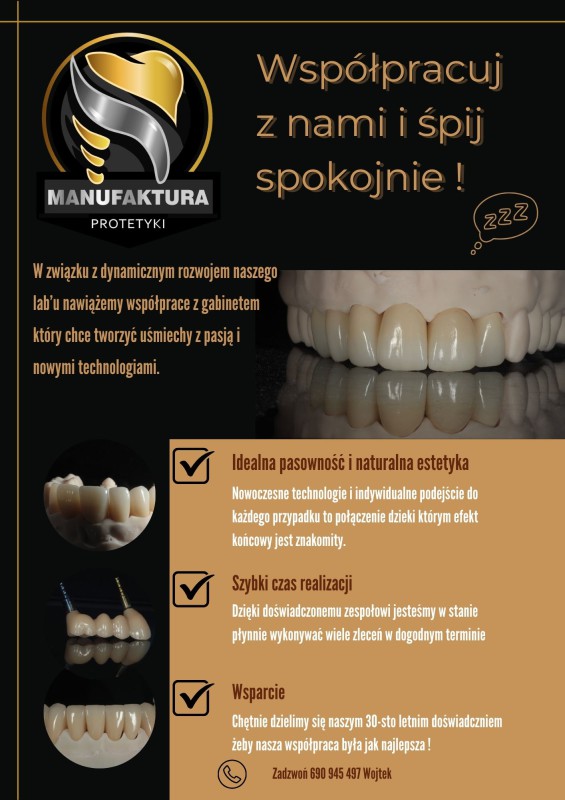 Dynamiczny rozwój naszego laboratorium spowodował zwiększenie mocy przerobowych więc poszukujemy konkretnego klienta któremu zależy na wartościowych pracach cechujących się : - Wysoką estetyką wykonania - Konkretnym i omówionym planie leczenia - Jakością i starannością wynikającą z pracy obu stron, laboratorium jak i kliniki/gabinetu - Komfortową atmosferą. Ze swojej strony jesteśmy w stanie zapewnić terminowość i wysoką estetykę od modelu po ostateczne uzupełnienie. Pracujemy z powodzeniem na wyciskach jak i skanach z wszelakich skanerów wewnątrz ustnych. Wysyłamy prace kurierami na całą Polskę, w okolicy Rybnika-Gliwic-Wodzisławia dowozimy i odbieramy pracę własnym kierowcą.