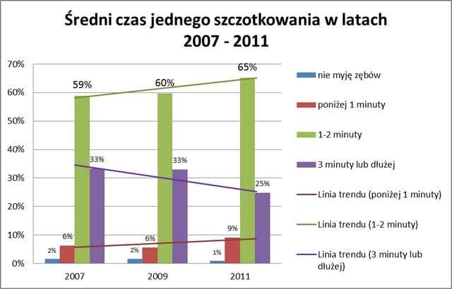 Pytanie o średni czas szczotkowania zębów wykazało wyraźny spadek rzetelnego czasu szczotkowania, który wynosić powinien około 3 minuty. Zaobserwowano spadek 3 minutowego czasu szczotkowania zębów o 8%, na korzyść szczotkowania poniżej 1 minuty – tu wzrost wynosi 3%.