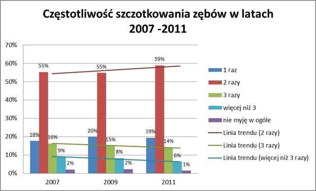 Na przestrzeni lat 2007-2011 przeprowadzono badania ankietowe(1), w których wzięło udział ponad 40 000 internautów. Osoby badane to Polacy, którzy w ponad 90% ukończyli 18 lat. Wśród wielu pytań uwagę przykuwa trend Polaków do zaniedbywania higieny jamy ustnej połączony ze spadkiem częstości wizyt u stomatologów.