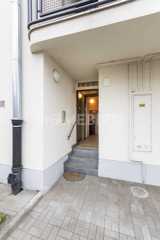 Lokal usytuowany jest parterze kameralnego budynku wzniesionego na początku lat 30` XX wieku. Wejście prowadzi po schodkach bezpośrednio z ogrodzonego podwórka - bez klatki schodowej, ani korytarza wspólnego z innymi lokalami - przez niedużą sień do holu i przedpokoju, z którego przechodzi się do pokoi.