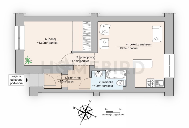 Mniejszy pokój od strony dziedzińca ma kształt zbliżony do kwadratu z dużą wnęką, w której zaaranżowano pojemną i funkcjonalną garderobę, oddzieloną od głównej przestrzeni przesuwnymi drzwiami. Drugi, nieco większy pokój ma okna o zachodniej ekspozycji wychodzące na ul. Pawła Suzina. We wnęce zaaranżowany został aneks kuchenny oddzielony od pokoju wyspą w formie wolnostojącego mebla. Łazienka wyposażona została w umywalkę, lustro, wannę i ustęp.